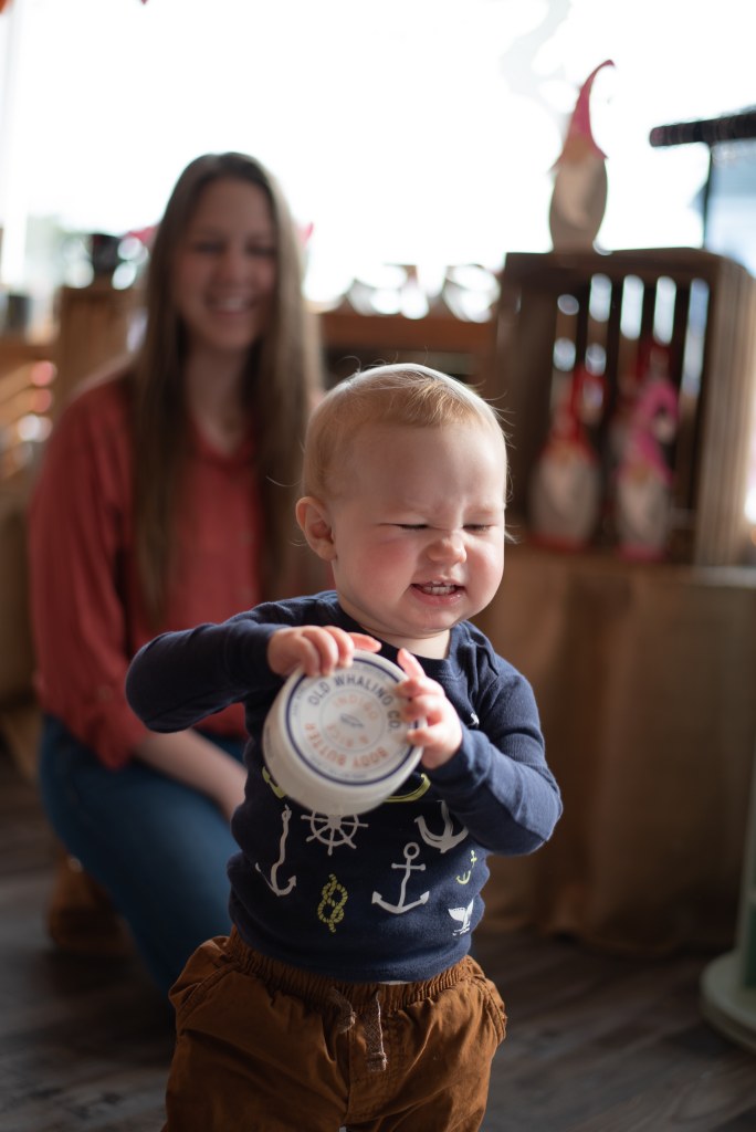 He comes to work with her everyday and I am willing to bet the locals stop by only to see him sometimes, sorry Skylar. However, if you need a dose of blue eyed, happy giggles stop in! He will not disappoint and seeing as he is running around now, he will probably welcome you at the door.