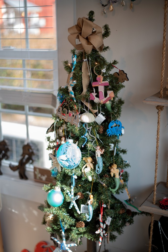 In addition to her LOVE chairs and ornaments she has created Oyster Trees. These Christmas themed trees are made from oyster shells that her father, Stanley, donated to her from his own business. Always thank a water man when you see one, they provide the yummy seafood that can be purchased or eaten at any of the restaurants on this island. Her coordinate signs have also been a big seller as well. So big that she also created crab ornaments with the Chincoteague coordinates on those as well.
