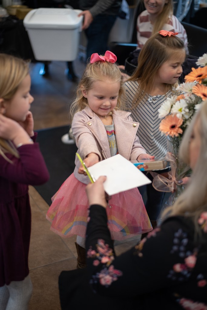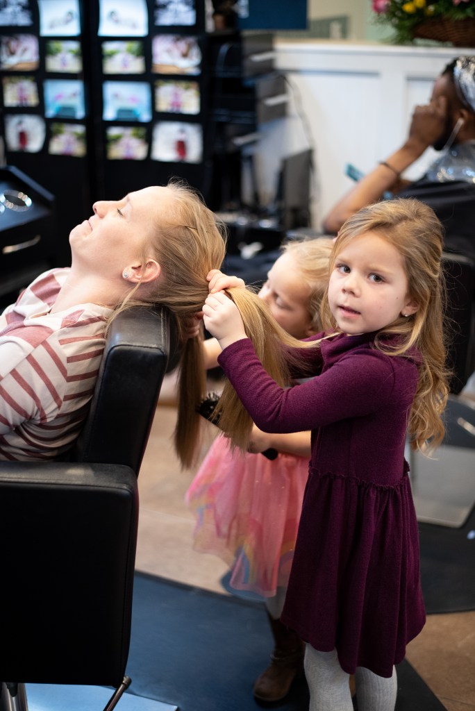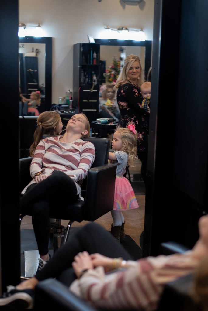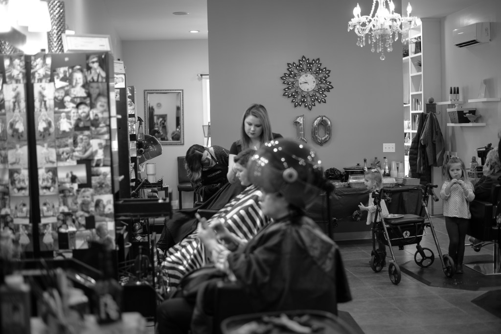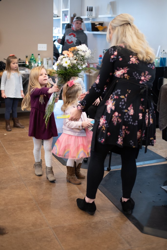 Shannons husband Matt has been by her side since we were all in middle school, oh those Mary N. Smith days. The love and adoration they show for each other is one for the books. Together they have two beautiful girls and a handsome boy. There is no doubt in my mind that her girls look up to her and want to be just like their mommy! They were the absolute sweetest darlings on their Mom’s ten year anniversary! They surprised her with flowers, candy and a card. I could have melted right then and there. When you get to the bottom look for the adorable photo of R & L working on a clients hair while their mom watched in Awe. Again, I could have melted.