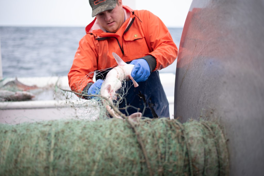 Fast forward about 15 miles off shore and we have finally made it to our destination. As we are all getting our oil skins, jackets and boots on, I am praying I don’t bust my nose losing my footing. Wow it is really rocking out here. I get my gear on and grab my camera because that was the whole purpose of coming out and head to the deck. My brother, Donnie, and nephew, Cole are getting things ready to pull up the first net. The barrels are all in place and the rope is being spun in. I snap some shots and patiently wait for the net to show its face but let’s be honest, I am not patient. What feels like eternity later here comes the net, with some sharks in it!