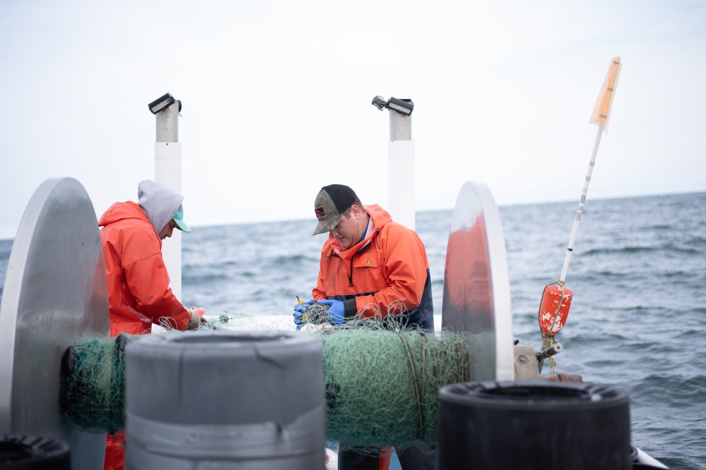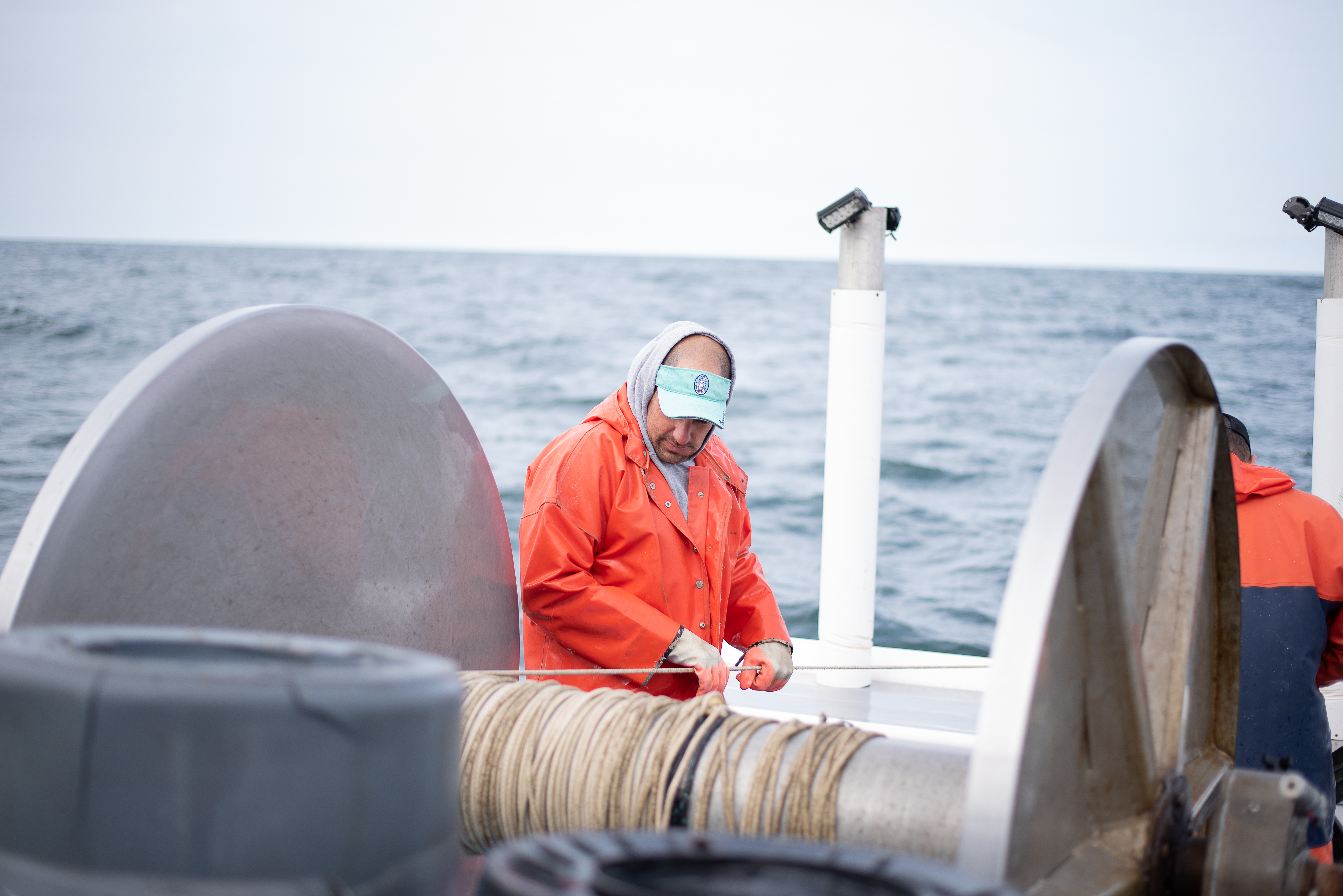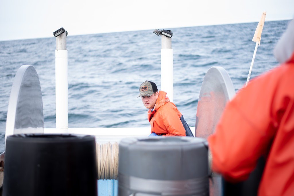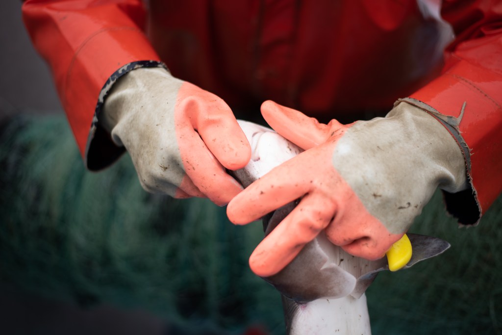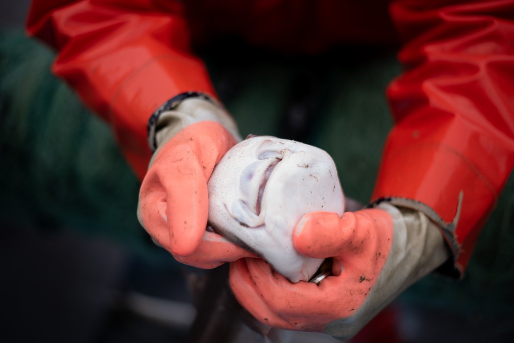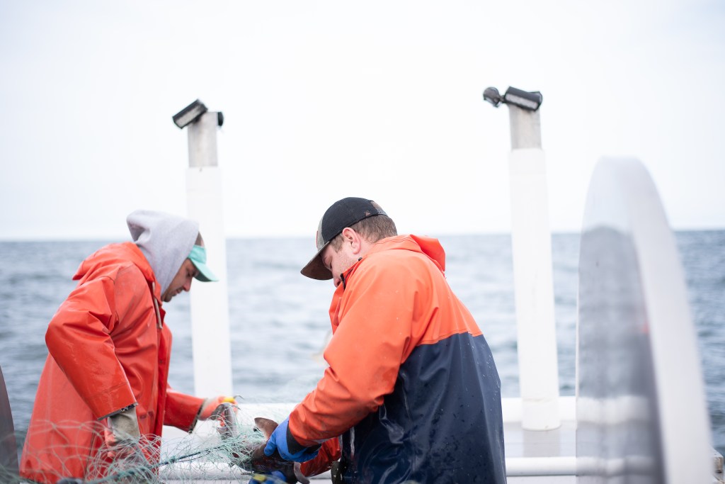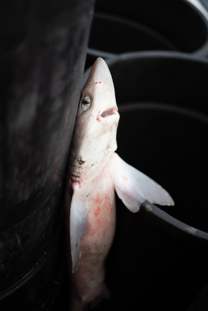 I’m not going to lie, it was really cool to watch them diligently pull this net up and get the sharks untangled from it and put into barrels to take in. I was even more impressed as I started to become ill that they were doing just fine. The more net they pulled in, more sharks spilled out. Even the occasional skate or spider crab came along with it. I kept snapping away despite losing my footing a couple (1,000) times. It was a pretty day to be on the water, the sun was peeping out and the seagulls were surrounding the boat waiting for some lunch. The waves weren’t spilling over the sides like I thought they would be, but they were certainly rocking the boat front to back and side to side. Probably a good thing as my brother was being funny and throwing the sharks a little harder so they might ricochet off me like a backboard and into the barrel. Dodge-shark champ over here! The sharks are not what you typically might think of. They look like little sand sharks and while they have razor sharp teeth, they won’t bite you. If you slide your finger across their teeth, they will slice you up pretty bad, but who is going to put their finger in any sharks mouth. Not this girl. The two worked really well together putting the net up on the reel, making sure it was winding the way it was supposed to all while removing the fish from the nets.